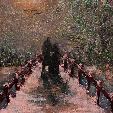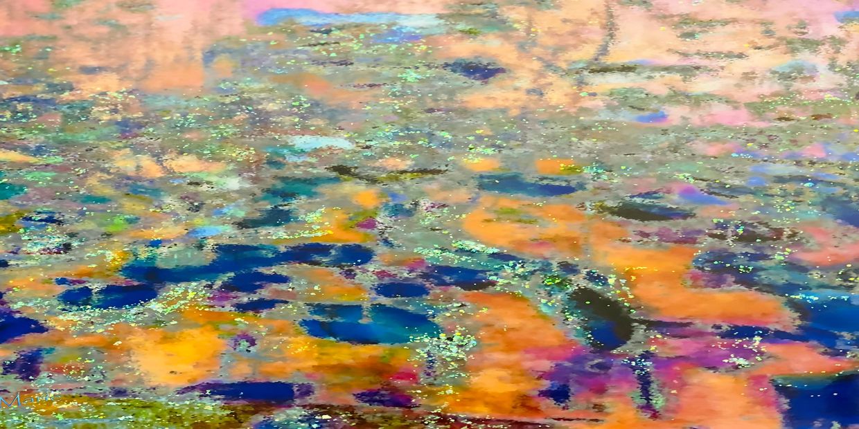 This is my painting" Sunset over the Lily Pond," but it is just a partial of the painting and it glows with iridescent paints in the light spots!